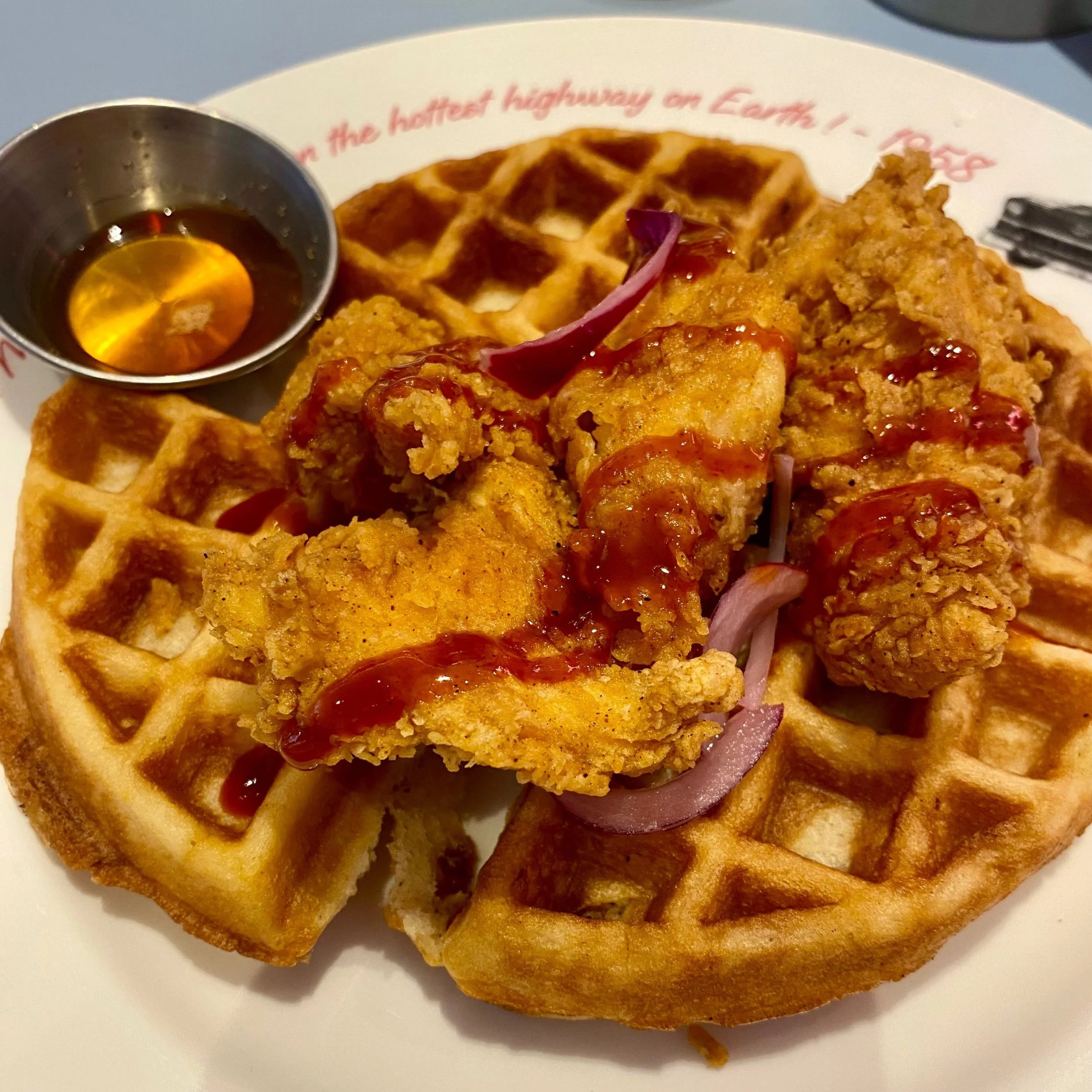 Waffles with bacon, chicken strips and sauce - 6th Street Diner - Ariva